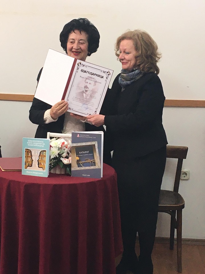 Директорката на библиотеката Гордана Змејковска на проф. на д-р Вера Стојчевска – Антиќ и додели специјална благодарница со која НУ Библиотека „Григор Прличев“ ја прогласи за нејзин почесен член.