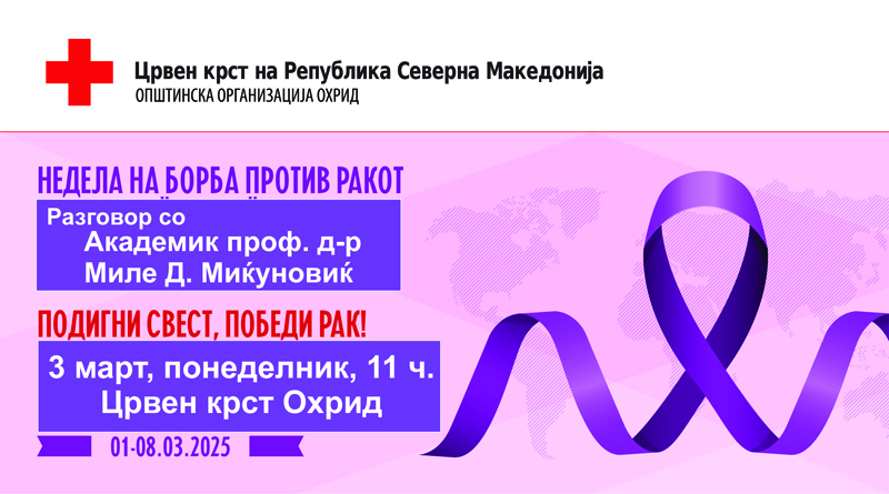 Во таа насока, Црвен крст Охрид организира предавање-разговор со Академик проф. д-р Миле Д. Миќуновиќ за малигните заболувања со акцент на рак на простата, кое ќе се реализира на 03.03.2025 (понеделник) со почеток во 11 ч., во просториите на Црвен крст Охрид.