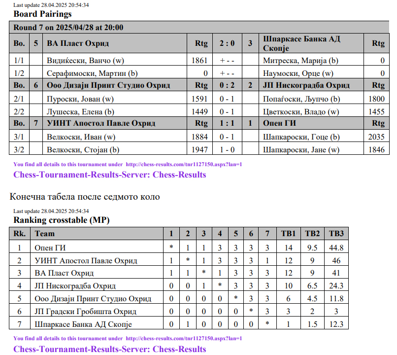 Денес, (28.04.2025) се одигра седмото коло од Бизнис лига Охрид 2025 во шах, во организација на ШК Ласкер Охрид.