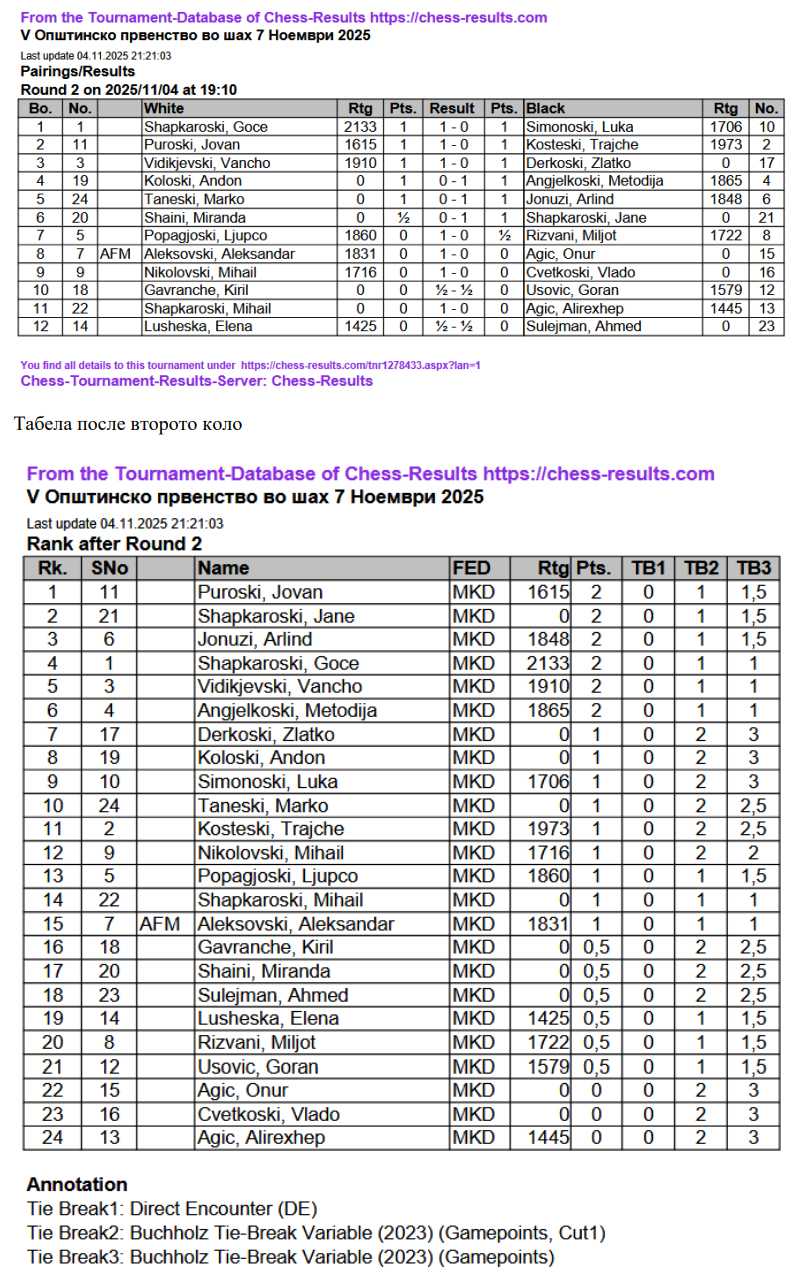 Спорт Резултати од второ коло од V Општинско првенство во шах 7 Ноември 2025 04/11/2025 Денес (04.11.2025) се играше второто коло од V Општинско првенство во шах 7 Ноември 2025. Постигнати беа следните резултати: Facebook Messenger Twitter Gmail Viber Print
