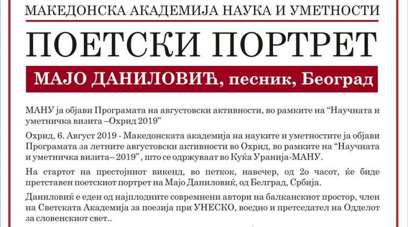 Годинешното, долго, охридско културно лето, лето – во функција на подигнување на алармот: Александар Попоски (свечено отворање на фестивалот “Охридско лето”: Јас ќе ГОВОРАМ “Диво месо”,а вие слушајте ДИВА ГРАДБА!), Славко Упевче: (Уметничка брана пред незапирливиот налет на мафијашките орди!?), соноќа ,во премудрата “Света Софија” – со поетско-ликовниот перформанс на Драган Спасески Охридски, а потоа и на на “Долни Сарај” ( Со музичко-сценскиот перформанс на Дуке Бојаџиев осмислен во Њујорк: Затемнета сцена и запалени свеќи!?), вечерва, во “Куќа Уранија” – МАНУ, од 20,00 часот (Мајо Даниловиќ, член на Светската академија за поезија на УНЕСКО и претседател на Одделот засловенскиот свет, со поетски перформанс, осмислен во Равена, Италија, градот, како нашиот Охрид, под патронат на УНЕСКО.